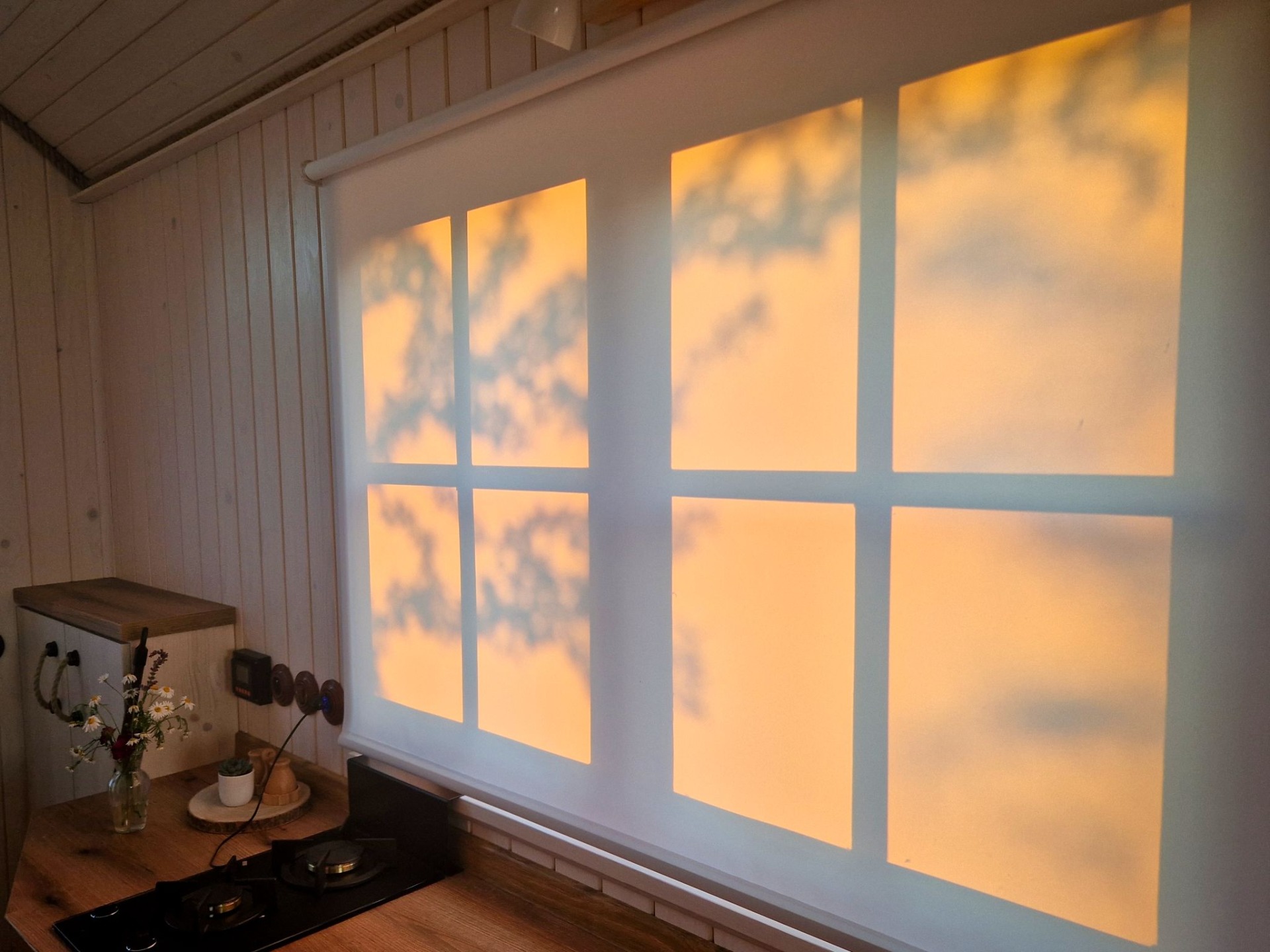 Je kompletně zařízen a funguje jako ostrovní systém. Od napájení elektřinou a vodou po kompostovací toaletu, ledničku a sprchu.